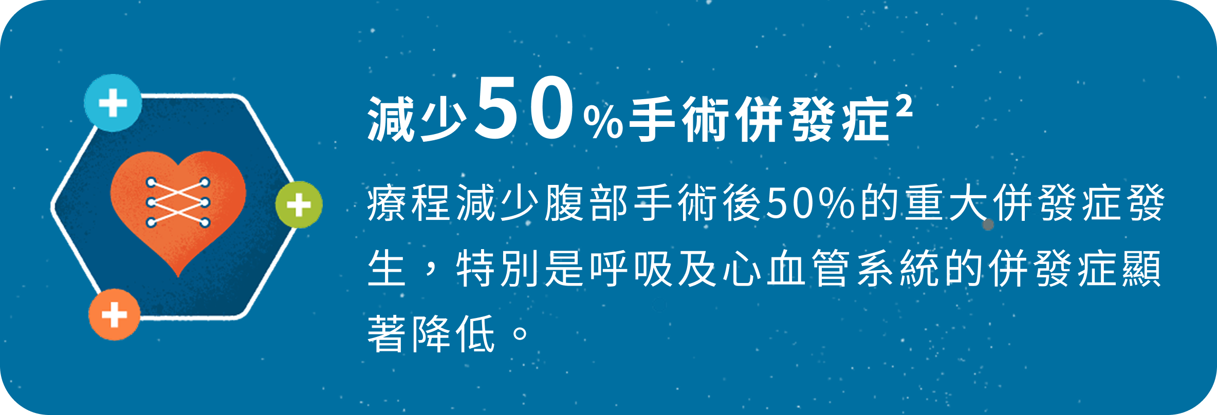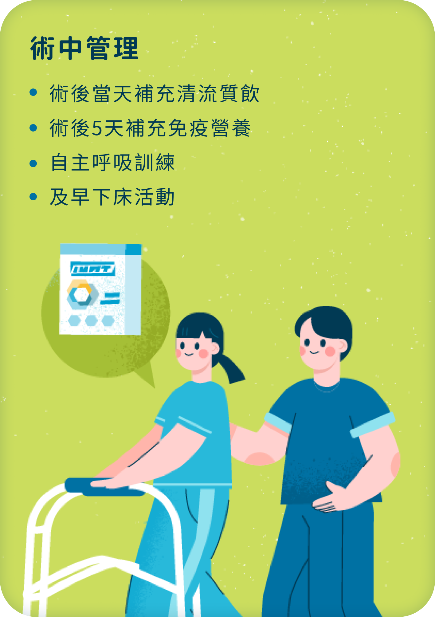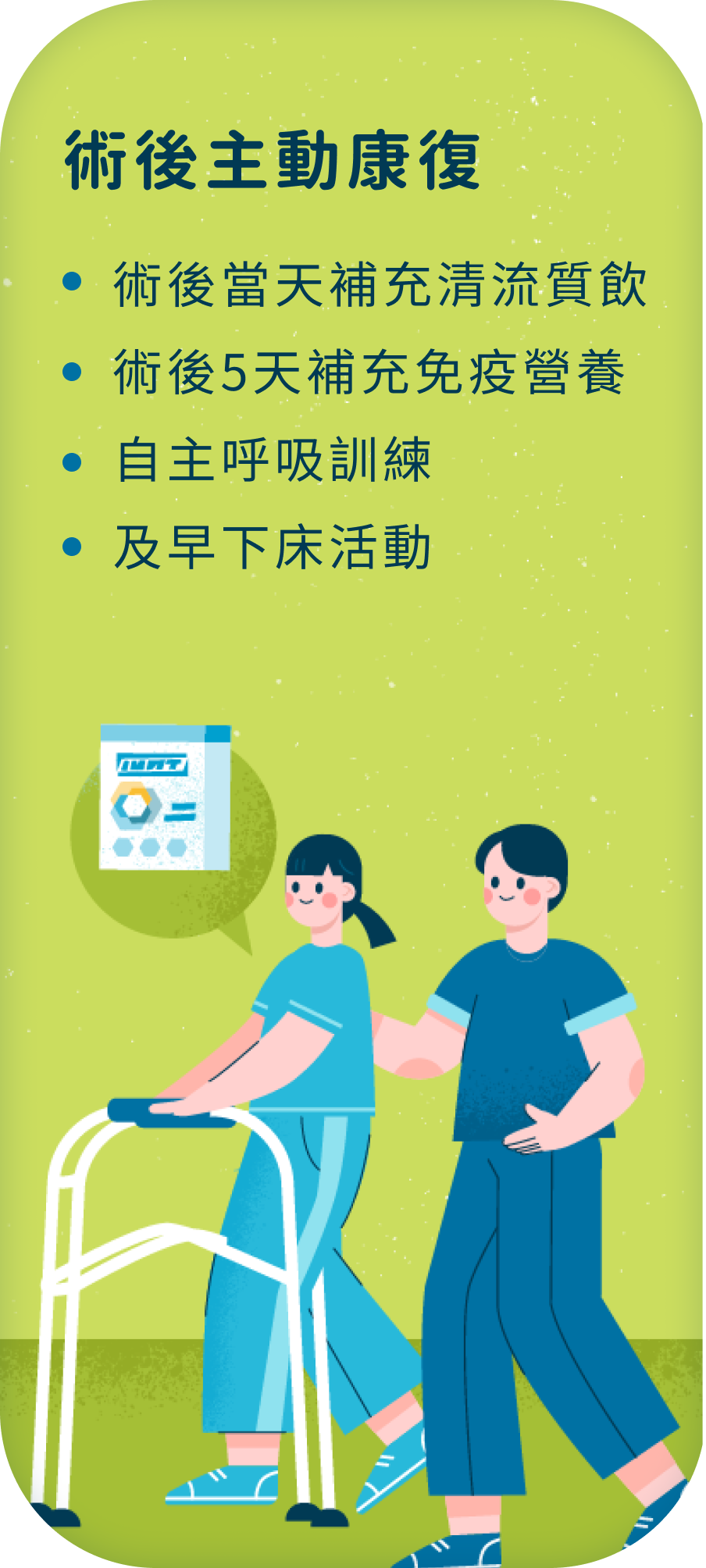 術後隔天開始下床運動與呼吸訓練,於術後5天搭配歐洲營養指南建議之3效免疫營養,加強術後免疫力