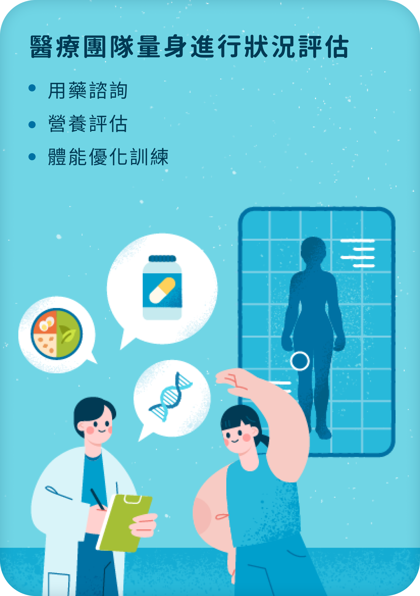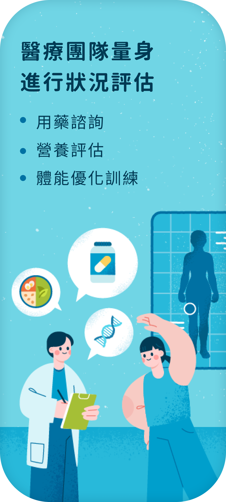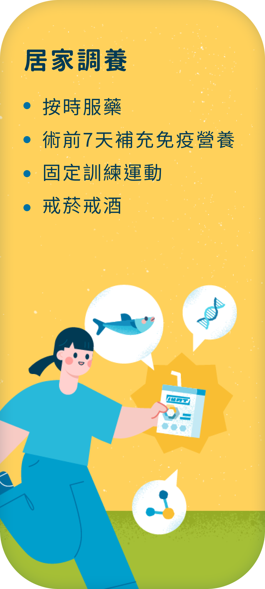 術後隔天開始下床運動與呼吸訓練,於術後5天搭配歐洲營養指南建議之3效免疫營養,加強術後免疫力