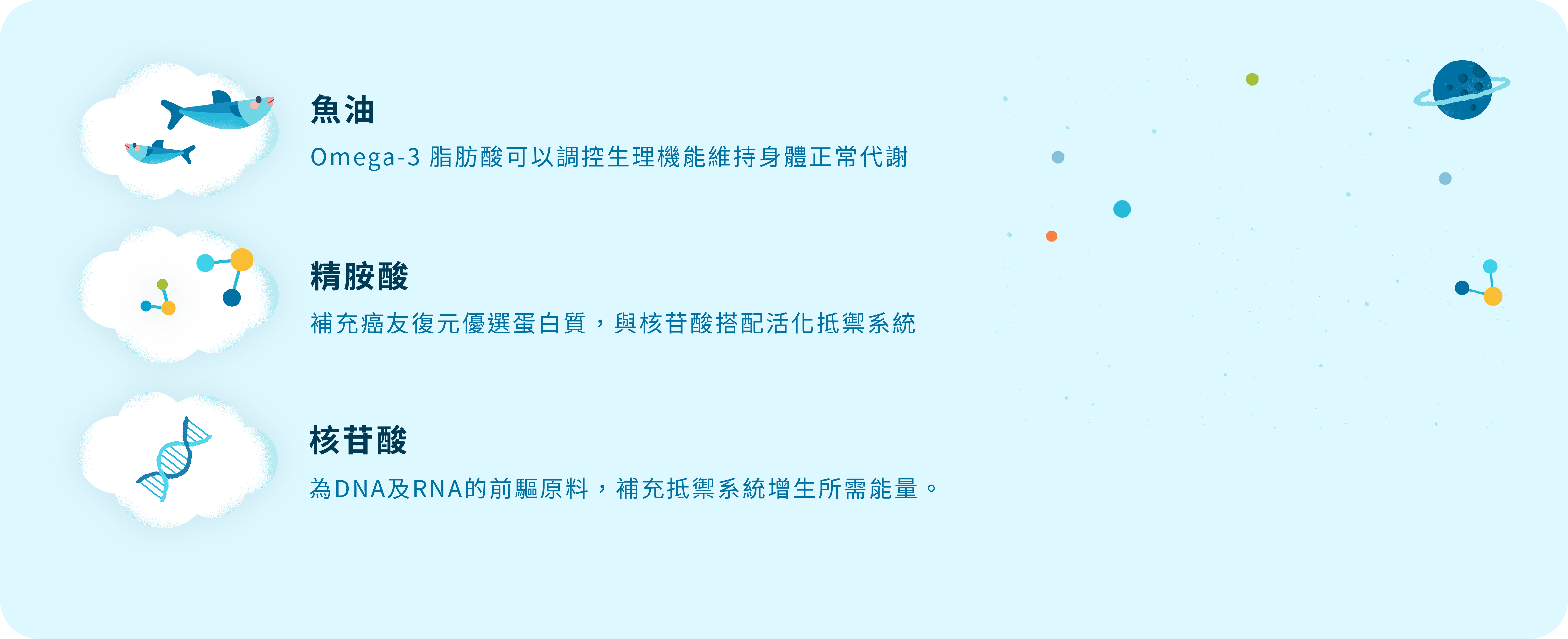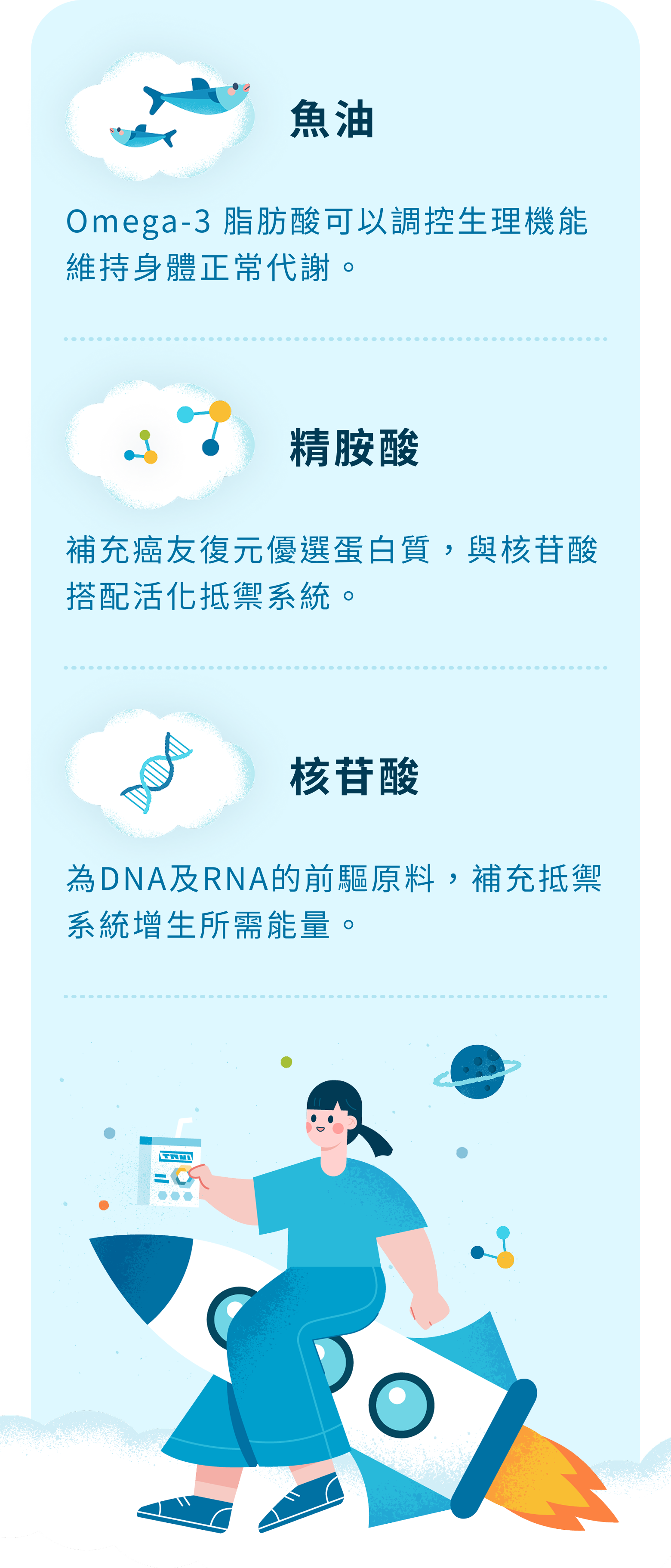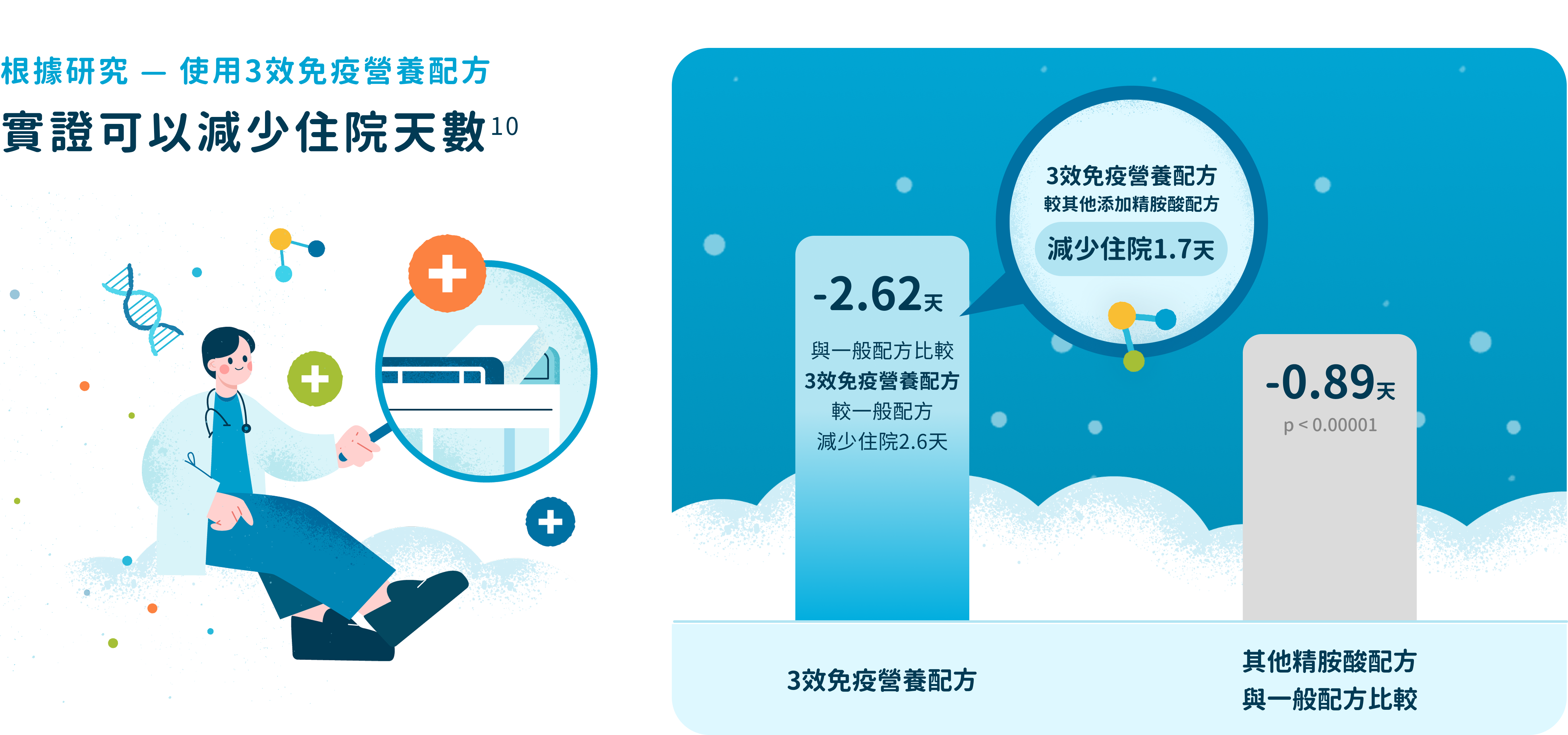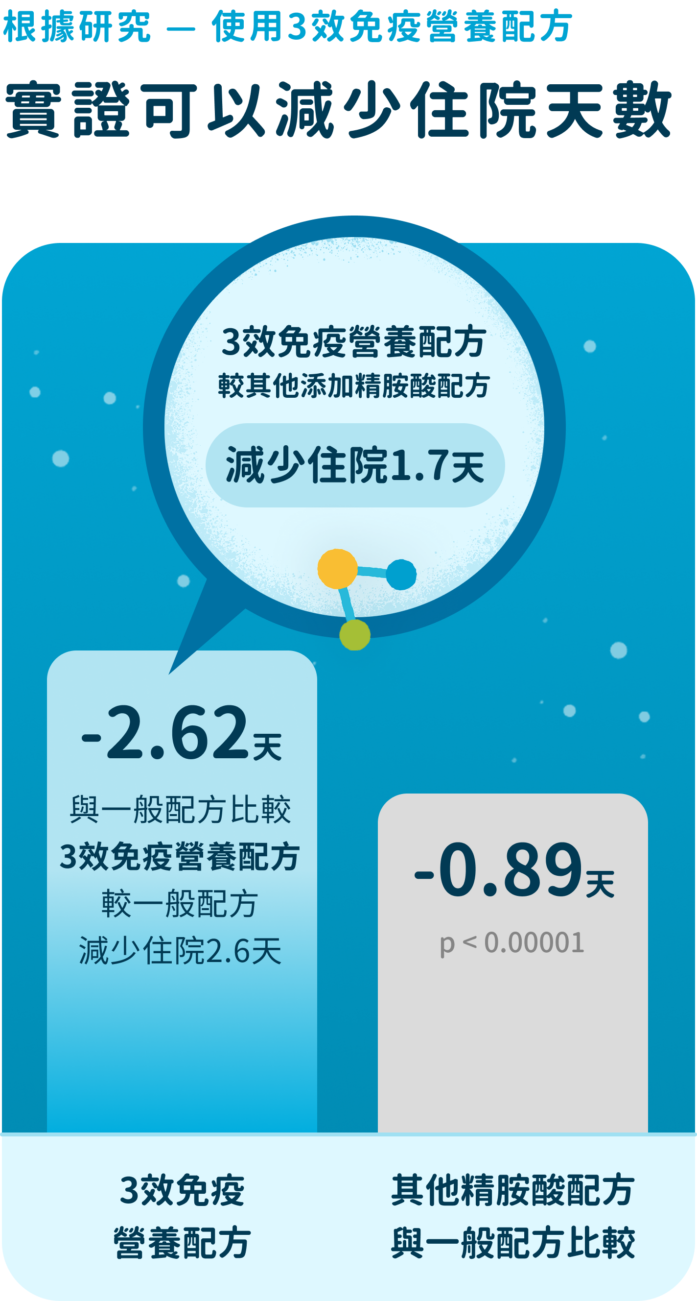 含有魚油、精胺酸、核苷酸。使用3效免疫營養配方,實證可以減少住院天數